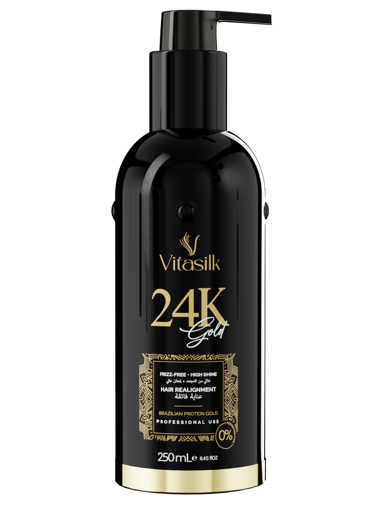 La protéine brésilienne Vitasilk 24K Gold a été développée avec un complexe défroissant innovant qui agit en synergie sur la fibre capillaire. Grâce à ses protéines de faible poids moléculaire et ses acides aminés, elle aide à réparer, reconstruire et protéger les cheveux fragilisés par les traitements chimiques.